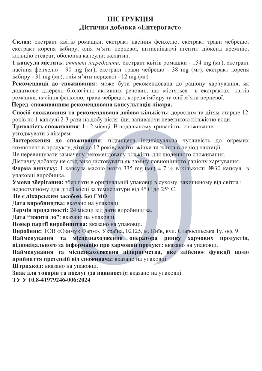 Склад: 1 капсула містить: екстракт квітів ромашки - 154 mg (мг), екстракт насіння фенхелю - 90 mg (мг), екстракт трави чебрецю - 38 mg (мг), екстракт кореня імбиру - 31 mg (мг), олія м’яти перцевої - 12 mg (мг); антиспікаючі агенти: кальцію стеарат, аеросіл; оболонка капсули: желатин.