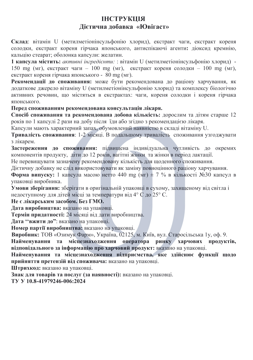 Склад: 1 капсула містить: вітамін U (метилметіонінсульфонію хлорид) - 150 mg (мг), екстракт чаги – 100 mg (мг), екстракт кореня солодки – 100 mg (мг), екстракт кореня гірчака японського - 80 mg (мг); антиспікаючі агенти: кальцію стеарат, аеросіл; оболонка капсули: желатин.