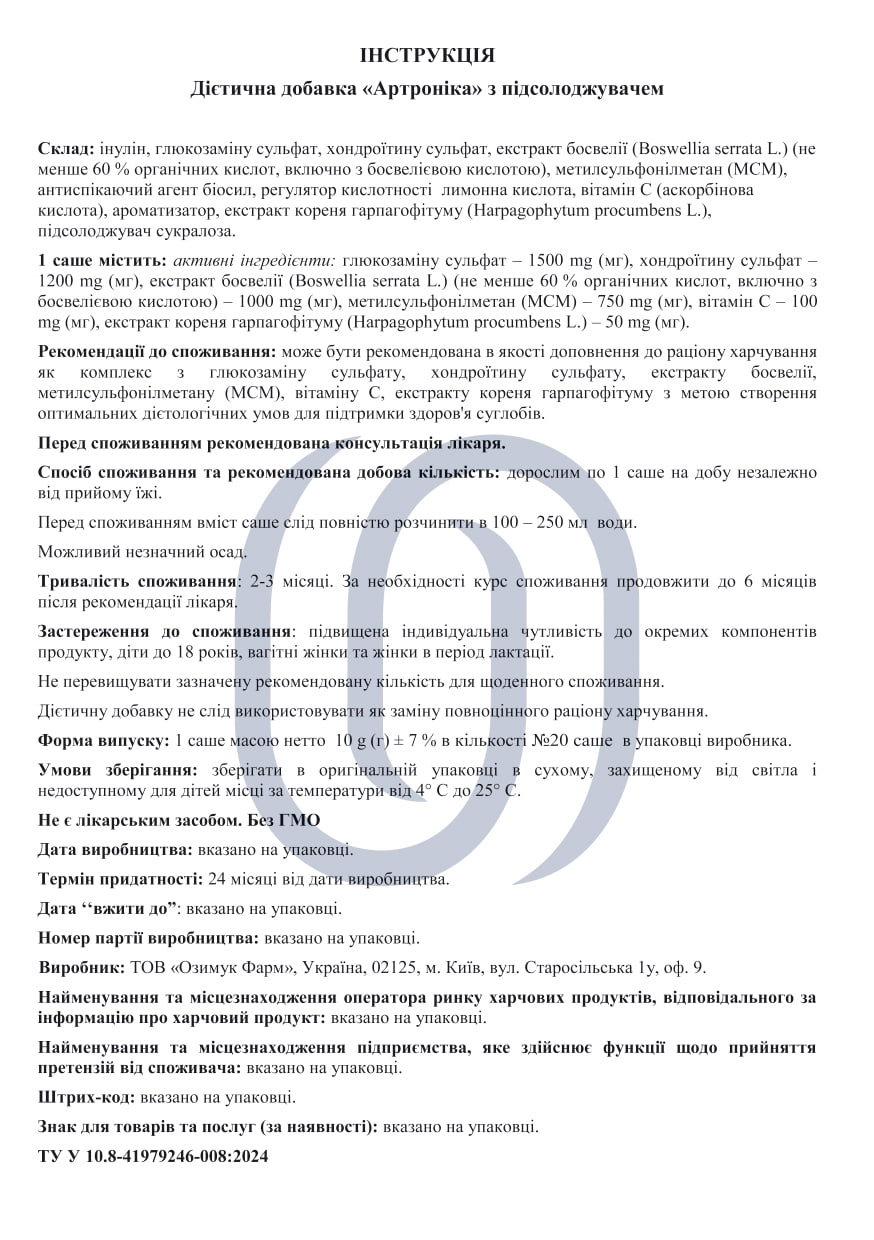 Може бути рекомендована в якості доповнення до раціону харчування як комплекс з глюкозаміну сульфату, хондроїтину сульфату, екстракту босвелії, метилсульфонілметану (MСM), вітаміну C, екстракту кореня гарпагофітуму з метою створення оптимальних дієтологічних умов для підтримки нормальної функції суглобівГарантія якості